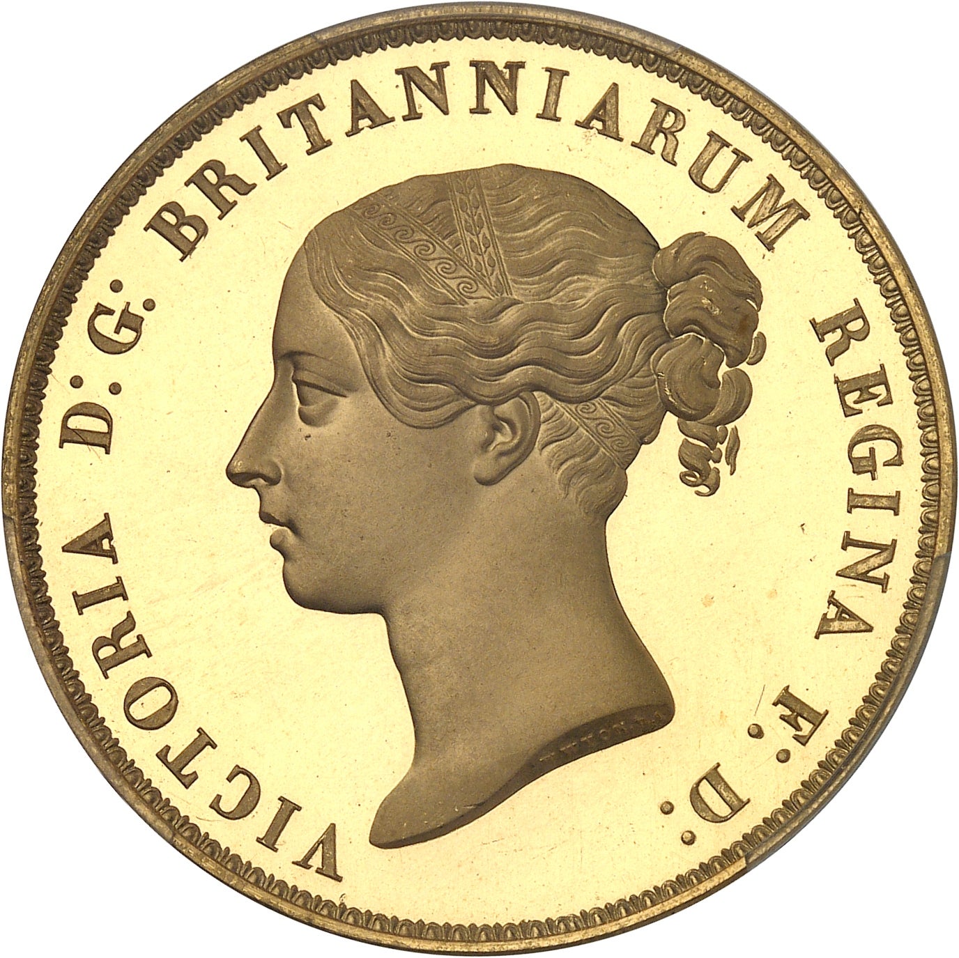 Victoria (1819–1901), pětilibra z roku 1839, ražba Královská mincovna, zlato 39,94 g, průměr 37 mm. SPINK 3851. Dražený exemplář je nejkvalitnější ze všech, které byly hodnoceny numismatickou posuzovací společností NGC. Zcela výjimečně intenzivní cameo, mincovní pole jsou zcela bez rýžek a poškození. Nejhezčí známý kus. Vyvolávací cena 1 000 000 EUR.