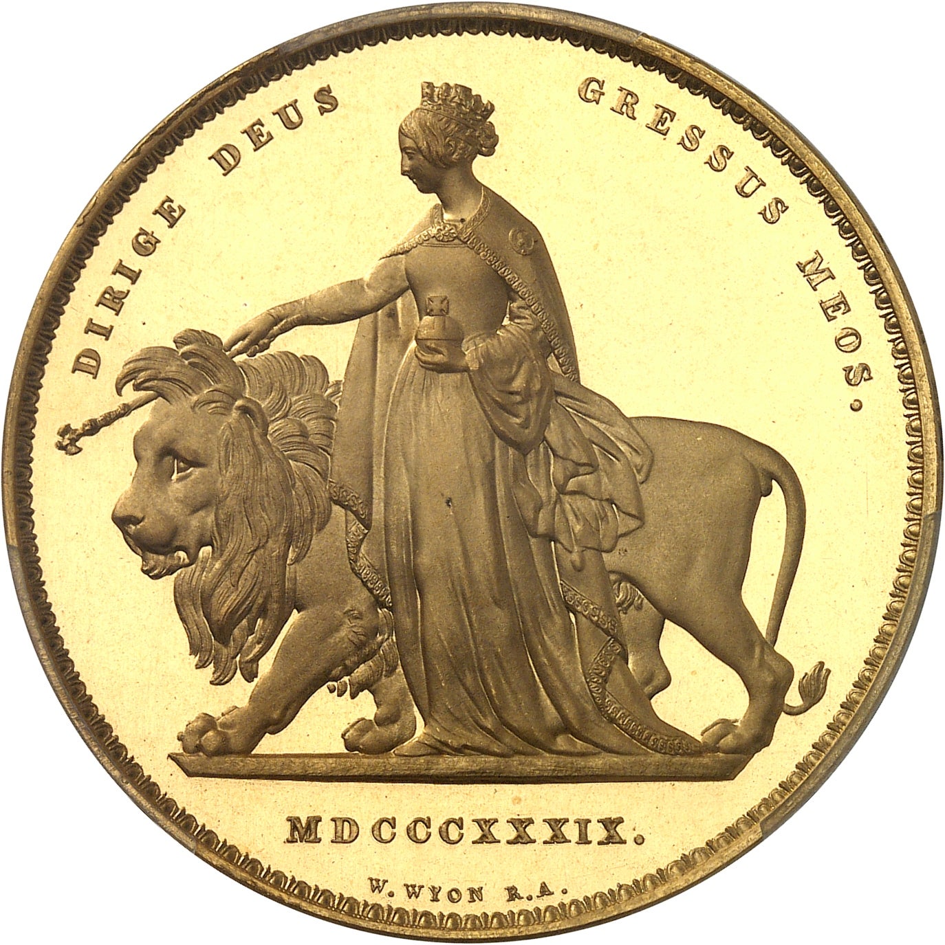 Na reversu vidíme postavu královny kráčející vedle lva, s latinským opisem DIRIGE DEUS GRESSUS MEOS – Bože, veď mé kroky. Královna Viktorie je vyobrazena jako poetická Una držící žezlo, zatímco lev, ochránce Uny, symbolizuje Anglii. Je zde silný kontrast mezi zdrženlivou energií vyjádřenou lvem a klidem a grácií stojící postavy Uny. Lev zobrazený na minci má přímou paralelu s heraldickým lvem na znaku Anglie. Obraz mladé královny, která klidně vede symbolickou reprezentaci národa, tedy tvoří silný a evokativní symbol. Kromě latinského motta se na reversu nachází vročení mince 1839 římskými čísly – MDCCCXXXIX čili rok po Viktoriině korunovaci. Medailová kvalita obrazu na rubové straně ukazuje Wyonovy mistrovské schopnosti jako umělce a také jeho vynikající řemeslný talent pro vytváření raznic.