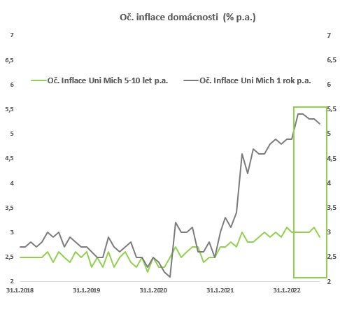 Ekonomové a investoři se snaží vidět situaci v budoucnu, podniky vyhodnocují aktuální situaci nákupních cen a jako poslední zaznamenává růst cen spotřebitel/domácnosti. Průzkumu zde se věnuje University of Michigan. „Zde není vidět nijak znatelný pokles v inflačních očekáváních pro dalších 12 měsíců, nicméně se zdá, že růst se stabilizoval a také pro střednědobý horizont už je očekávání výrazně nižší. Lze očekávat, že spotřebitelé ze tří zmíněných skupin budou upravovat svá očekávání s největším zpožděním,“ dodává Marek Ševčík.